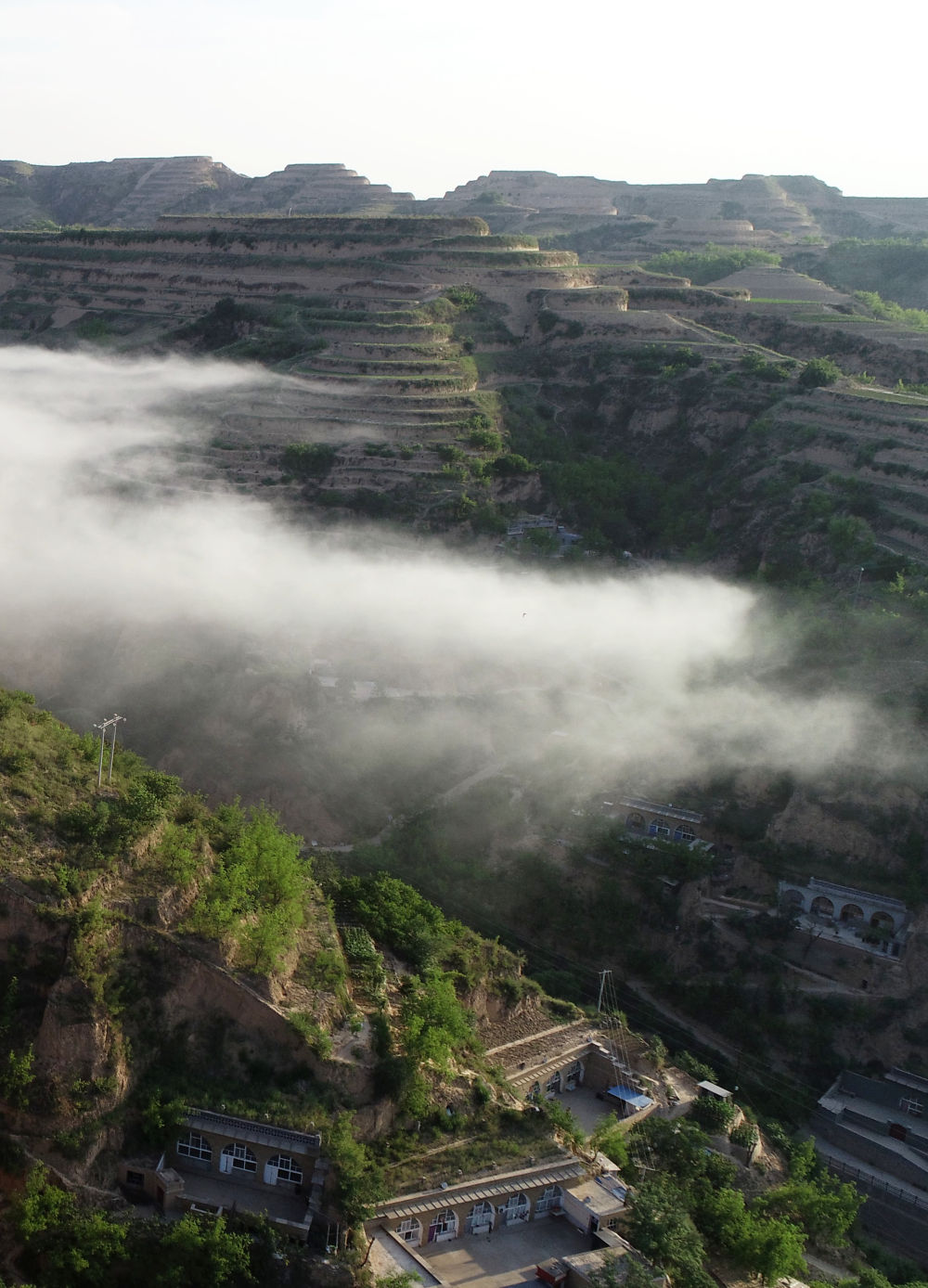 晨雾中的绥德县郝家桥村(2022年6月17日摄,无人机照片)。新华社记者 陈昌奇 摄