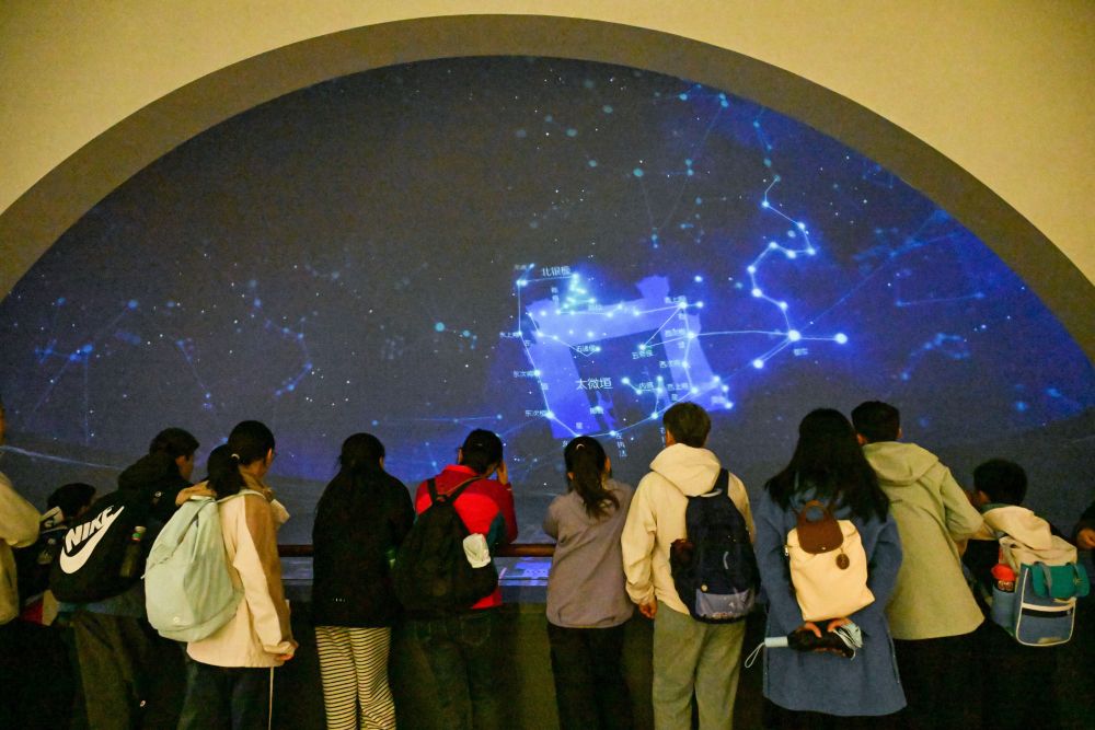 ↑4月2日,志愿者带托管班孩子在江苏省海安市科技馆观看机器人表演。新华社发(周强摄)
