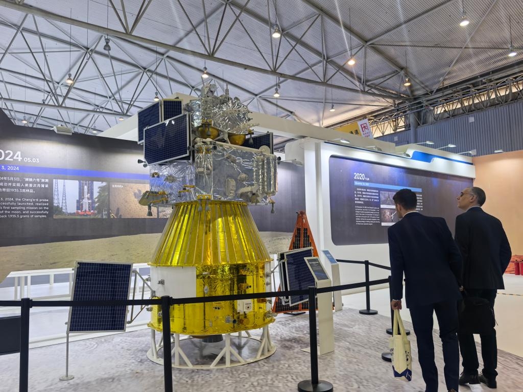 成都世纪城新国际会展中心展出的嫦娥六号四器组合体模型。新华社记者 李倩薇 摄