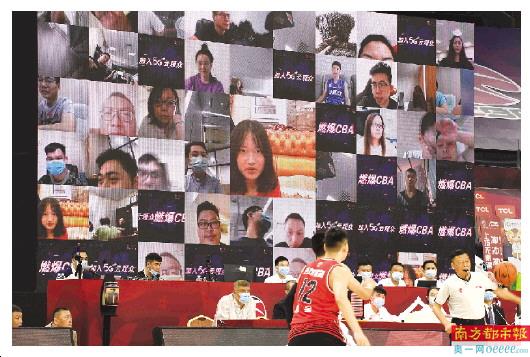 而球馆看台上除了可以看到毛绒公仔、为各队加油的标语、形形色色的球衣助威方阵以及根据不同场次不断调换的主队LOGO外,CBA这次还特意在两个场馆正中央竖立起一块巨大的LED屏幕,比赛过程中一直在滚动播出提前征集来的球迷留言评论;同时在暂停休息环节里,大屏幕还会播放当场比赛主队拉拉宝贝们的舞蹈视频以及各地球迷方言加油的音频;碰到关键时刻,赛会还会通过5G手段去连线那些正在场外收看比赛的球迷,把他们在家中“云看赛”的情景投到现场大屏幕上,让球员们找回被现场围观的感觉;而每场比赛的MC也像从前一样用高亢的解说全程增添气氛,最后还会在比赛结束时引领双方球员一齐向“云端”的观众们致谢。