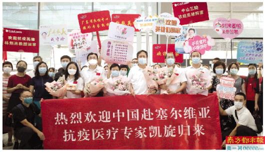 6月26日,广州白云国际机场里鲜花与掌声环绕,这是中国政府派出的援外抗疫医疗专家组中在外工作时间最长的一支队伍—中国赴塞尔维亚抗疫医疗专家组结束隔离休整返穗的欢迎活动。