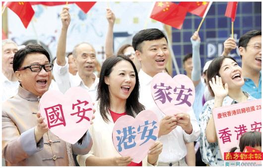 昨日,香港市民在太平山顶广场举行“庆祝香港回归祖国23周年”快闪活动,庆香港回归,贺国安立法