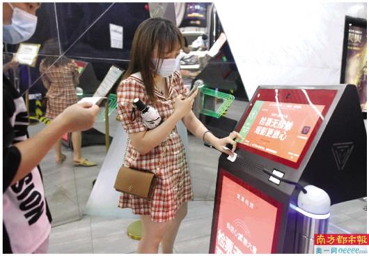 7月20日,观众在广州市五月花电影城通过扫码测温一体化的无人电子检票机扫码入场。当日,广州市部分电影院在各项疫情防控措施有效落实到位的前提下,有序恢复开放。 新华社发 详见:A04-05·都市发布