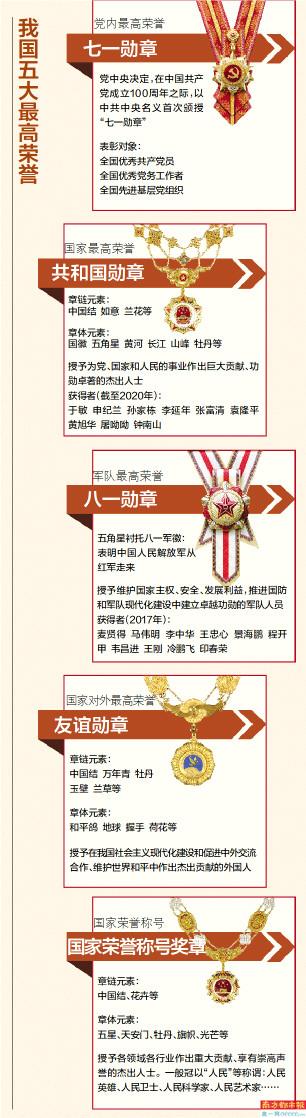 至此,以“五章一簿”为主干的功勋荣誉表彰制度体系被确立——“共和国勋章”、“七一勋章”、“八一勋章”、“友谊勋章”、国家荣誉称号,国家功勋簿。随着此次“七一勋章”的颁授,中国当下五大最高荣誉在中共成立百年之时,将全部颁齐。